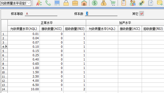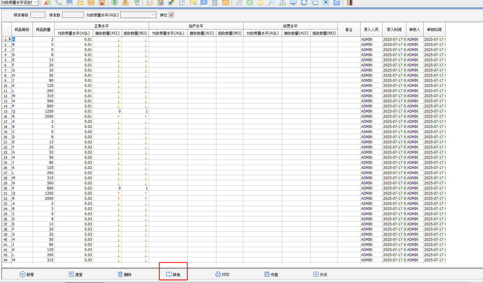 2. 允許質(zhì)量水平設(shè)定:點(diǎn)擊缺省,將載入最新的標(biāo)準(zhǔn)檔數(shù)據(jù)。 原來(lái)做法:允許質(zhì)量水平(AQL)對(duì)應(yīng)的接收數(shù)量(ACC)和拒收數(shù)量(REJ)是一一對(duì)應(yīng)的數(shù)值。