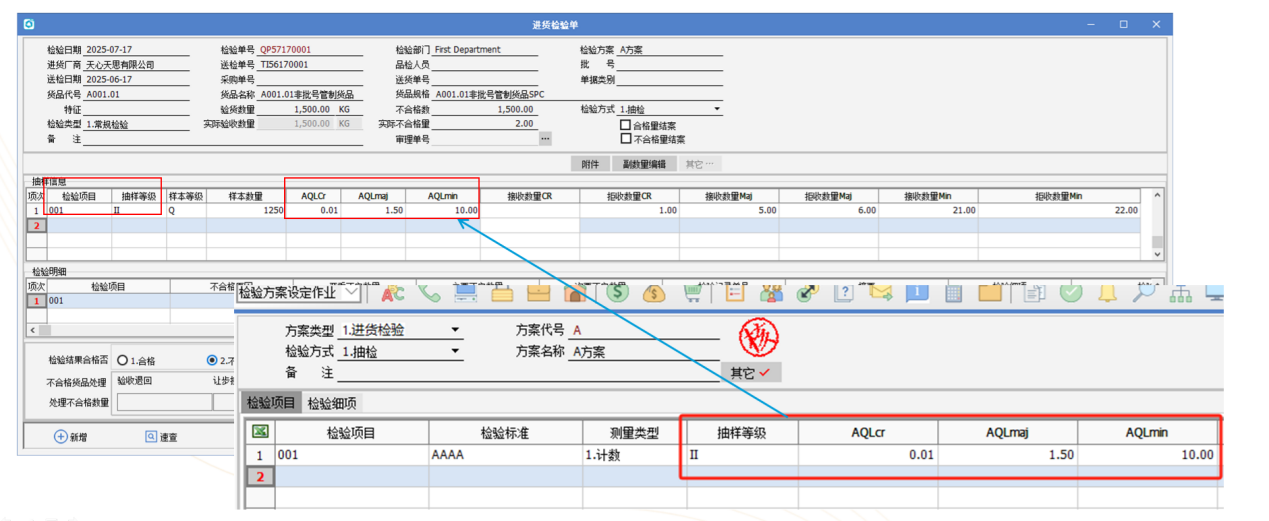 3.3 進(jìn)貨檢驗(yàn)單: 表頭轉(zhuǎn)入進(jìn)貨送檢單: A、表頭根據(jù)送檢品號(hào)帶出【貨品檢驗(yàn)方案設(shè)定作業(yè)】設(shè)定的方案。 B、根據(jù)方案,將檢驗(yàn)項(xiàng)目、抽樣等級(jí),AQLcr、AQLmaj、AQLmin的值帶到表身抽樣信息窗口。