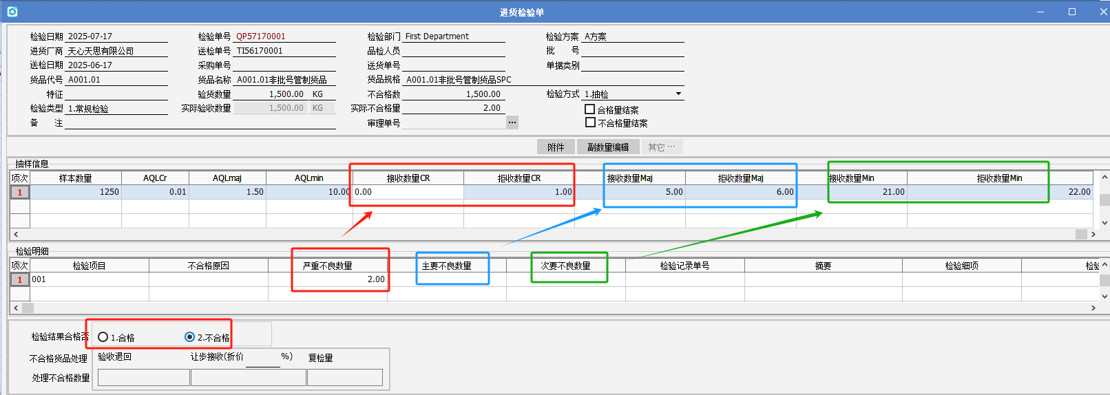 注意:當(dāng)送檢量小于樣品數(shù)量,進(jìn)貨送檢單的樣本數(shù)量就取送檢量,若大于樣本數(shù)量,就取樣品數(shù)量。 E、再錄入檢驗(yàn)明細(xì)的不良數(shù)量,即可判定檢驗(yàn)結(jié)果是否合格。根據(jù)下圖的不良數(shù)量對(duì)應(yīng)接收數(shù)量和拒收數(shù)量范圍來(lái)判定是否合格。最后單據(jù)保存即可。