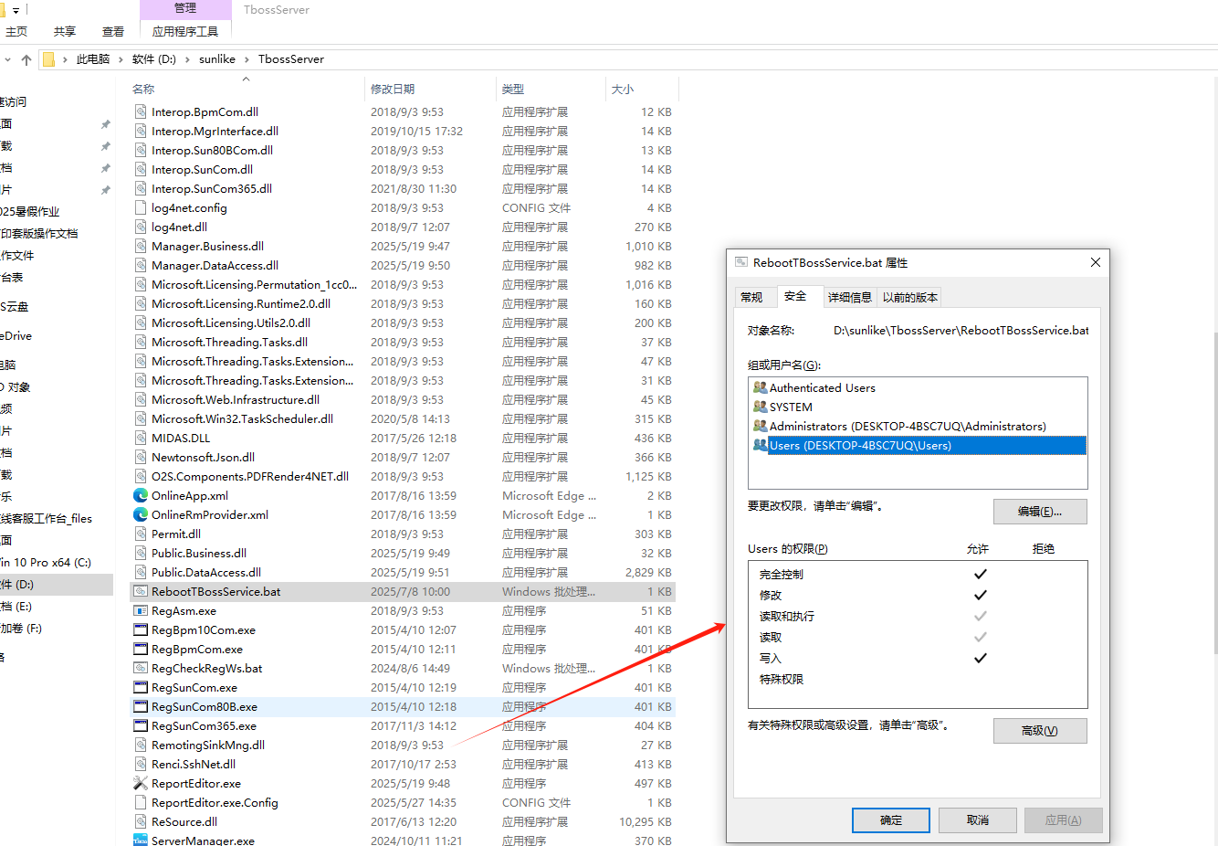 特別注意:RebootTBossService.bat文件的權(quán)限要全部給予